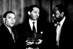 Television was just getting off the ground in the early 50s, and only certain programs were videotaped, so we must be grateful for this one remarkable scrap, in which we witness Bird and Diz playing Tadd Dameron’s “Hot House”, one of their seminal recordings from 1945. (This clip is readily available on Youtube.) As important as this performance is, the introduction that precedes it is equally valuable. Bird and Diz are presented their awards by clueless white guy du jour, Earl Wilson, the gossip columnist for the New York Post. Also there is Leonard Feather, a true friend to jazz musicians, who seems to be in charge of looking uncomfortable. It’s a 50-second microcosm of American society in 1952, and includes a hilarious example of Bird’s subtle but unmistakable push-back against racism.