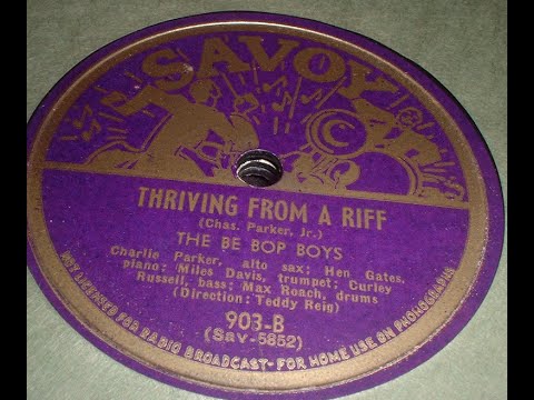 The playing time of 78 rpm records limited songs to a tyrannical three minutes, and early Bird enthusiasts had to subsist on a meager supply of recorded solos, some as brief as eight bars. On Billie’s Bounce, Bird takes four choruses, so that’s forty-eight bars at a medium bounce tempo, a very substantial helping. Now’s The Time is markedly slower, but Bird still takes three choruses, thirty-six bars, time enough to tell a complicated story. And he had enough elbow room on Thriving from a Riff to take two full choruses, sixty-four bars. It was a relative embarrassment of riches, raw material that aspiring modernists assimilated in short order.
