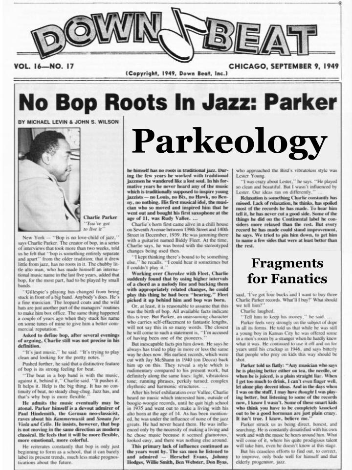 Thus begins the questionable Levin-Wilson article, published in Down Beat magazine on September 9th, 1949. Foremost among the questions is this: to what extent was Bird putting the authors on?