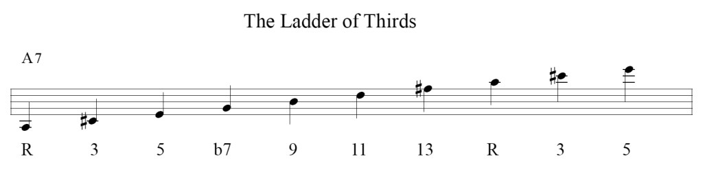 Whatever Bird’s revelation was, it must have been simple enough to be grasped on the spot. I will argue that it was a self evident, though not necessarily obvious, concept I call the “ladder of thirds.” (If there’s a proper jazz theory term for this concept, I have no idea what it is.)