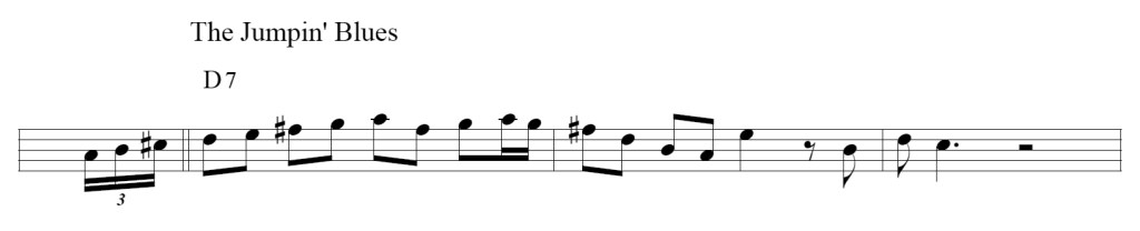 Bird says he learned the D major scale, but what form did it take? I submit that the opening phrase of his solo on “The Jumpin’ Blues” (Jay McShann, Decca, July 2, 1942) is an iteration of the D major scale that sprang from his earliest attempts at improvisation.