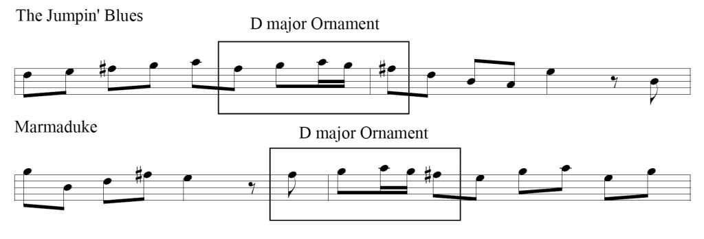 The third bar of “Marmaduke” contains the D major ornament first seen in “The Jumpin’ Blues.”