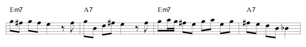 The second bar is “Honeysuckle Rose” shifted over by half a beat. This practice goes all the way back to Bird’s first recording, “Honey and Body,” the generally accepted date of which is early 1940. He repeats the “Honeysuckle Rose” opening phrase as a motive, shifting it by half a beat in the process: