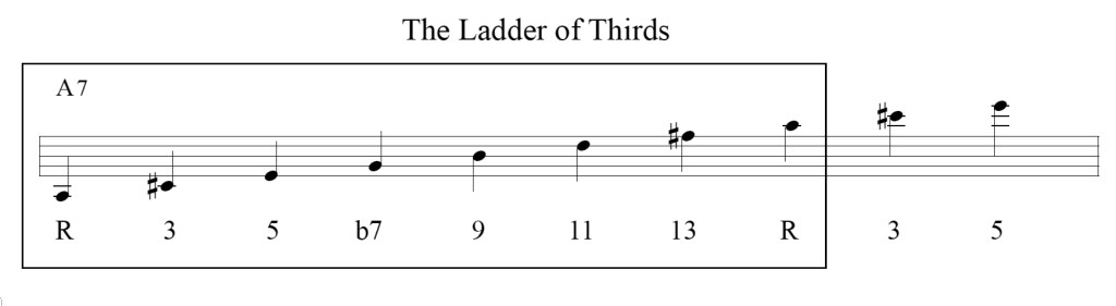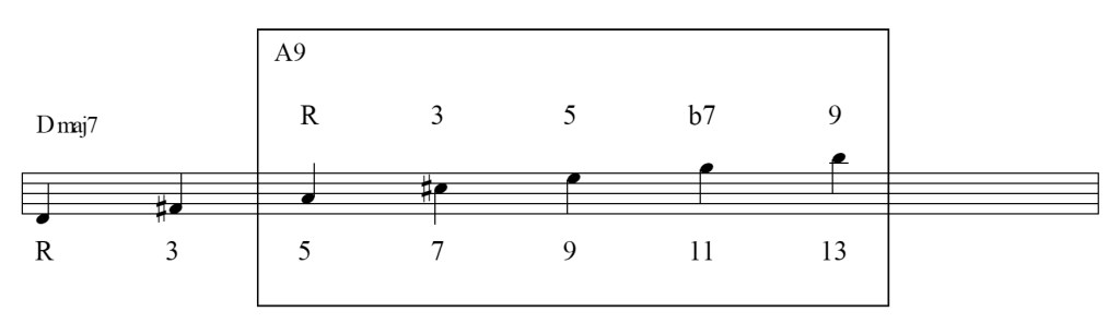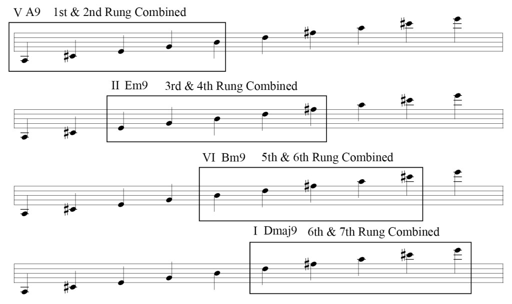 Following the same principle again, he realized that A9, built from the 5th of Dmaj7, formed the Dmaj7’s entire upper structure (notes transposed down an octave for readability), thus bringing the ladder of thirds back to its starting point.