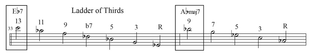 This would have been the moment of truth, when Bird realized that the Abm9 spells out the entire upper structure of the Db7. Again, both ladders above are easily playable on saxophone, from the 13th down to the root, and the same applies to the second half of the bridge, which continues the same pattern.