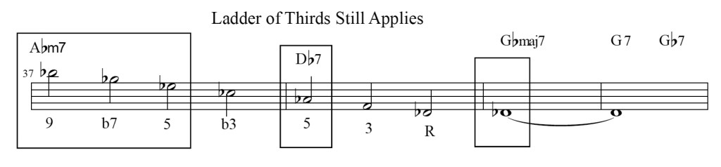 The melody notes (highlighted) explicitly walk down the II chord (Abm7) from the 9th, land on the 5th of the V chord (Db7) (written 8vb), and end up on Db itself (8vb). This can also be viewed as a descent via the ladder of thirds. The fact that it begins on the II chord and carries through the V chord only reveals the ladder’s function more clearly.