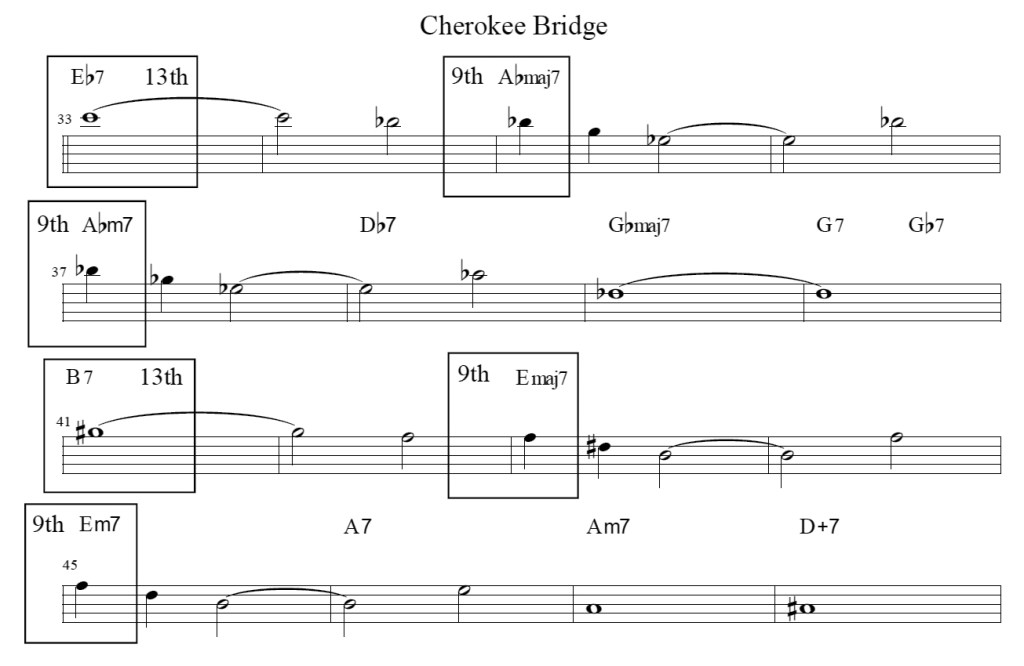 What was it about “Cherokee” that made this so apparent? In short: The bridge. To begin with, the melody has plenty of 9ths, which may have attracted Bird in the first place, but it also has two very telling 13ths.