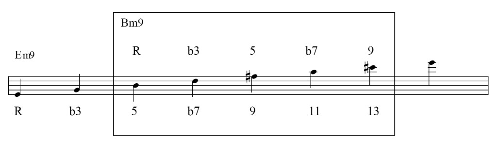 Following the same principle, he realized that the Bm9, built from the 5th of the Em9, spelled out the Em9’s entire upper structure.
