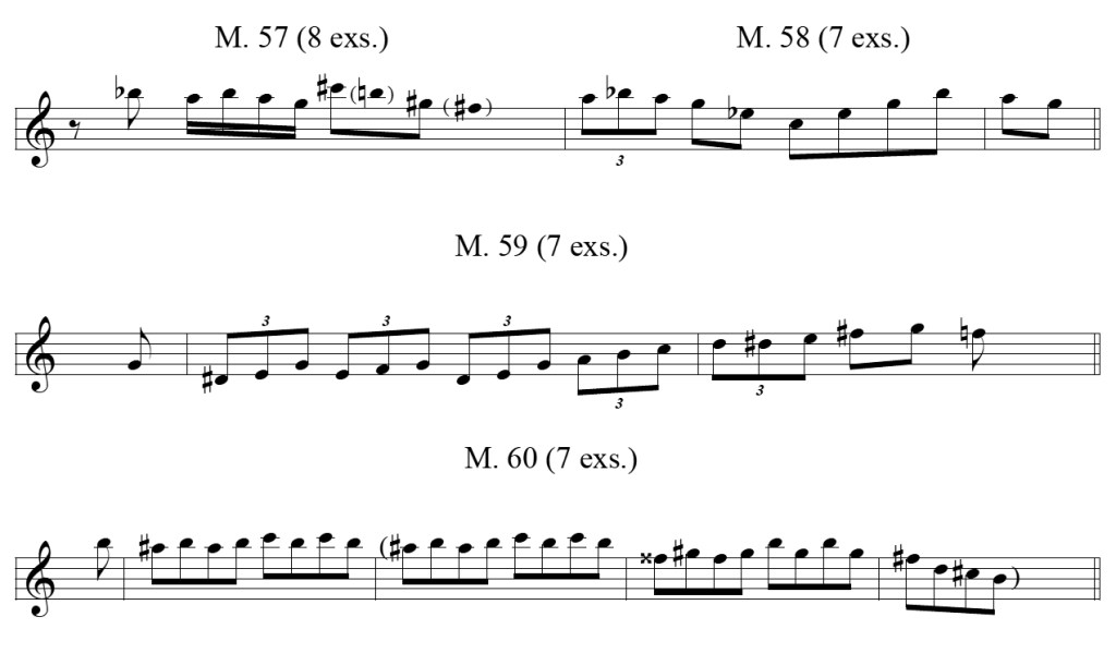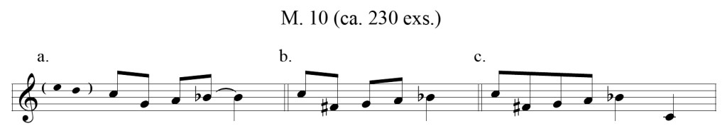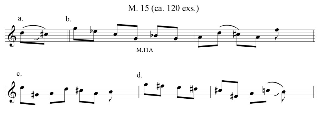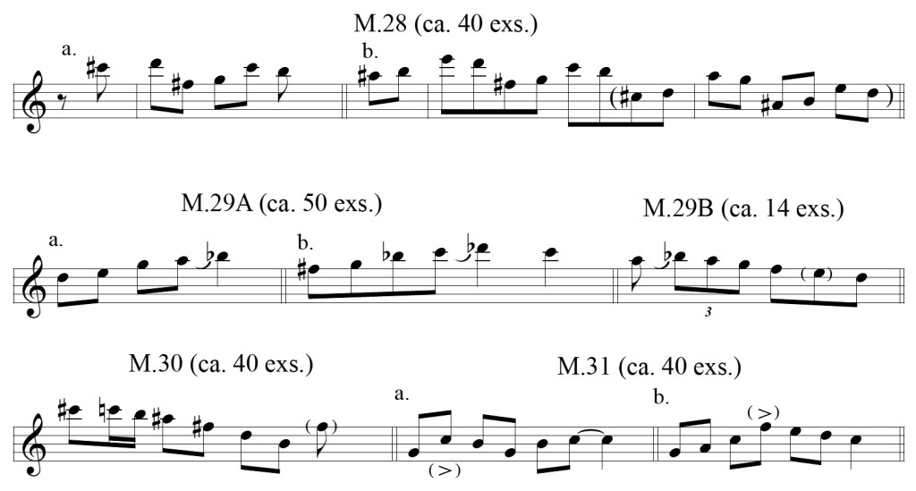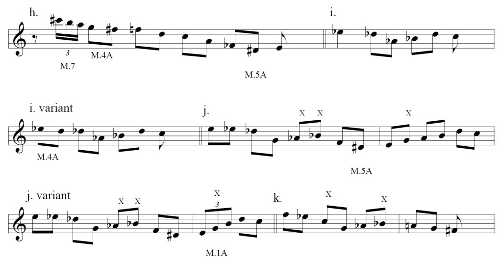 In contrast to the simplicity of M.7, the next group contains several inventively complex melodic patterns. The common feature of these figures is motion into the dominant via b7 and b6. Since more than 95% of Parker’s repertory is in the major mode, these notes are nearly always borrowed from the parallel minor mode. The most frequent short motives of this type appear in M. 8abcdef. They appear in a variety of keys. Decorated forms of M.8b and M.8c appear in M.8ghi. In these, b3 of the minor mode is also borrowed. These phrases, in contrast to the first five simple phrases, are absolutely linked to the keys shown, probably because they are easy to play in these keys. Finally, the last two phrases, while containing the basic elements of this group (indicated by Xs), begin with notes that are borrowed from C and D Phrygian. Phrygian borrowings to build harmonies were common in jazz years before Parker began to record; he probably had sonorities used by Duke Ellington and others in mind when he formulated these phrases. This same Phrygian borrowing can explain all of the M. 8 motives, although the absence of the lowered second scale degree in most of them makes such an explanation unnecessary.