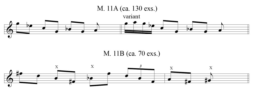 M.11A is a phrase for moving from ii7 to V7 in a major tonality. It usually appears in one of three keys, G, A, and B-flat. M.11B takes a variety of forms, but always contains the chromatic descent indicated by Xs.
