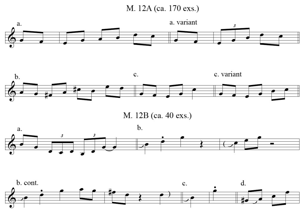 The figures of M.12A, with their motion through the notes of a triad, usually occur at or near phrase endings. They generally occur in moderate to fast tempos, on C and D major chords. M.12Ba is closely related and also serves a cadential function, but is limited to the end of the first phrase of a slow blues chorus in G. M.12Bb and M.12Bd again move through the notes of the tonic chord, but are generally phrase incipits. M.12Bc, a rare figure, appears only at beginnings of blues choruses in G.