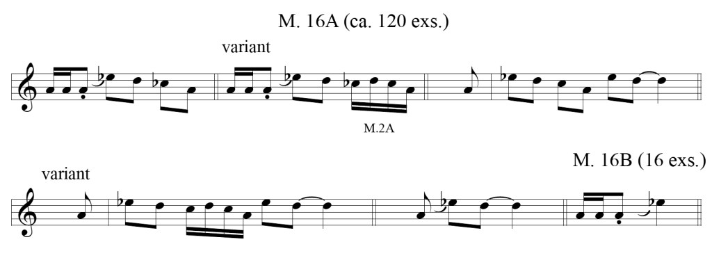 M.16A shows some of the contexts in which the diminished fifth appears (transposed to A for purposes of comparison). It appears in all the major keys from B-flat through E, and in some minor keys, but is most common in D major. The machine-gun-like incipit of M.16Aa usually follows a pause of several beats, so the motive attracts the listener’s attention immediately. Sometimes the short notes precede a portamento into the blue third rather than the blue fifth, as shown in M.16B.