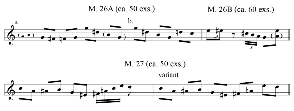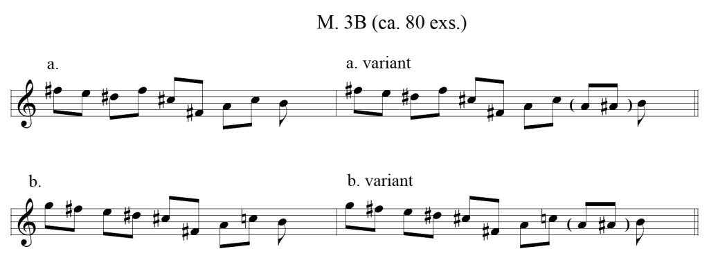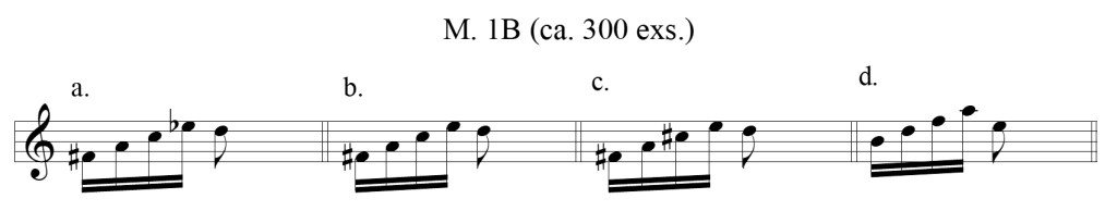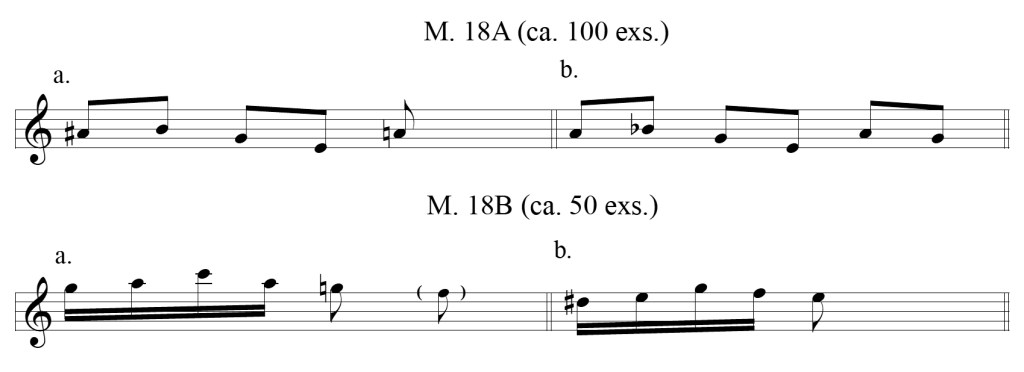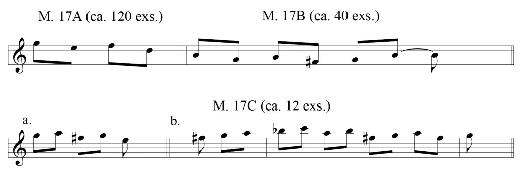 The last of the frequently-encountered motives, M.17A, generally occurs at the end of a phrase. An extension of this motive, M.17B, serves as a cadential figure, and appears only in G, F#, and F. Finally, M.17C changes the falling-third, rising-second pattern of M.17A into a rising-second, falling-third pattern.