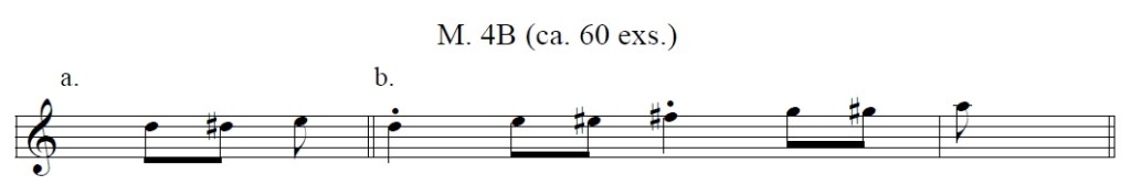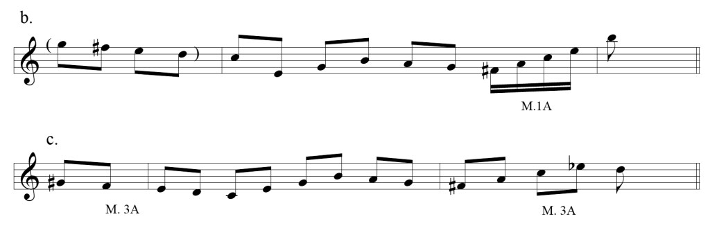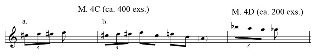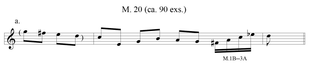 Four chromatic scale tones played in the time occupied by M.4A produce M.4C, a filled-in minor third. Here again, an unimpressive figure fulfills certain limited functions; most examples rise to the second or fifth degrees of the scale. This selectivity is due partially to the construction of the major scale, for 7 to 9 (or 2) and 3 to 5 are minor thirds. Further, the rise from 7 to 9 leads smoothly into an effective cadential formula that occurs occasionally M.4Cb. But the intervals from 2 to 4 and from 6 to 8 are also minor thirds, and the filling of these intervals accounts for only about 12% of the total. Parker’s preference for two of the four possibilities defies rational explanation. M.4D, the inversion of M.4C, occurs only half as often in the transcriptions. Its patterns of usage are less clearly defined.
