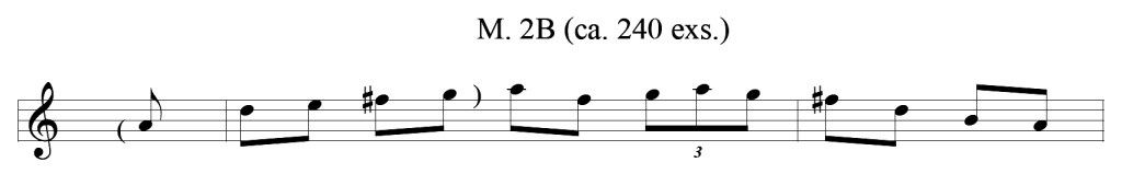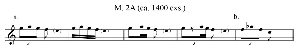 The other ubiquitous motive, M.2A, is even simpler in construction and easier to play than the ascending arpeggio. In its main form it is nothing more than an inverted mordent followed by a descent of a second, third, or fourth. In a few instances the initial minor or major second becomes enlarged, as in M.2A b. Because of its brevity and simplicity, the motive appears in virtually any context. Indeed, it is an incidental component in a number of more complex motives, as will be shown later.