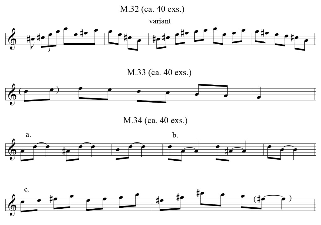 M.1 through M.17 constitute the great majority of repeated motives, but a large number of relatively rare motives, number M.18 through M.64, also appear in the transcriptions. Some appear so rarely that their inclusion in this list might seem unnecessary. However, they are included here for one or more of these reasons: 1) they are aurally striking when they do occur; 2) they appear several more times in untranscribed pieces; or 3) they are a characteristic of one particular key or group of pieces. All are shown at their most characteristic pitch levels. Pertinent remarks on selected motives follow: