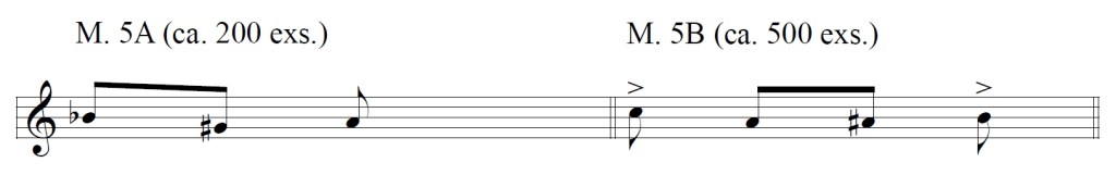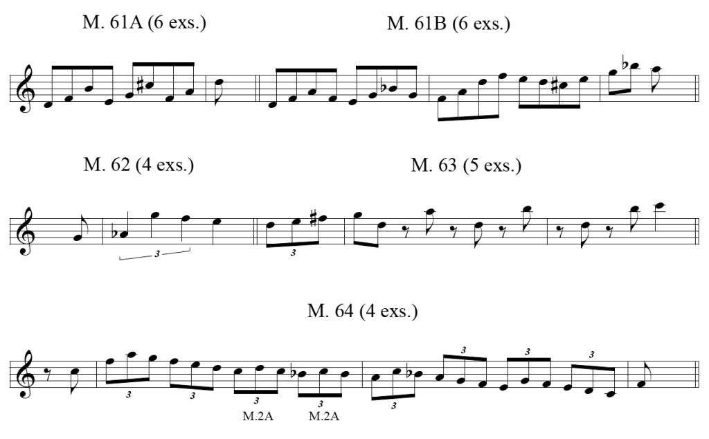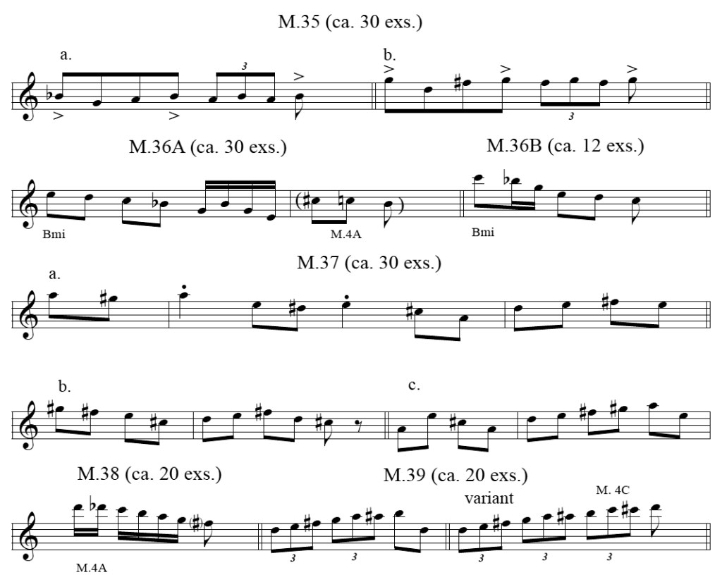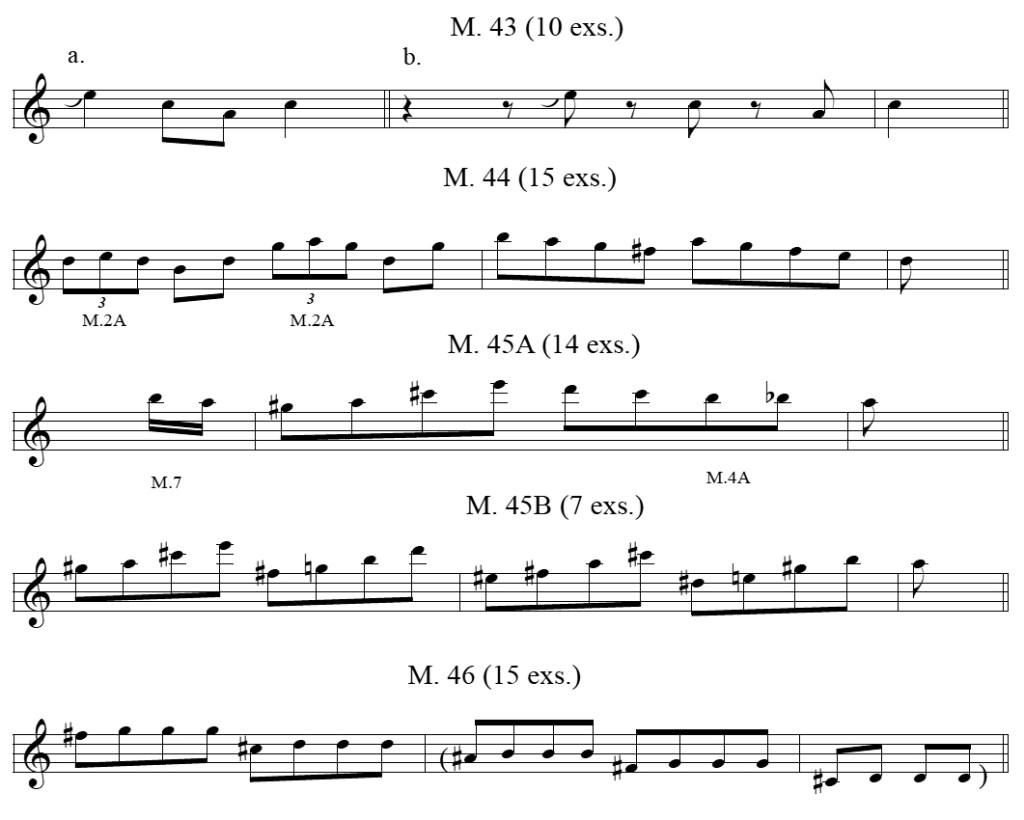 Two short motives, M.1A and M.2A, occur more frequently than any others. Each appears once every eight or nine measures, on the average, in the transcriptions.