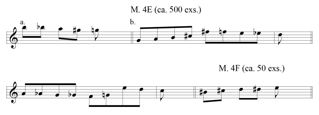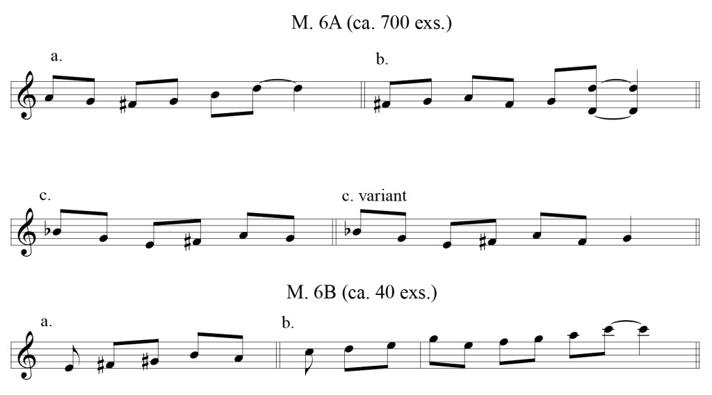 The chromaticism of the last two groups of motives contrasts sharply with the diatonicism of the next group. M.6A usually occurs as a cadential formula that encircles the tonic pitch in one of several ways. Nearly all tones serve as the pitch center for these figures, although M.6Ac almost always occurs in G. M.6B is not a cadential formula, but contains a similar encircling of pitch centers.