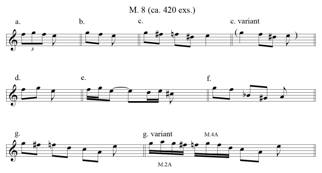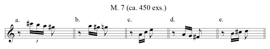 The phrase that is brought to a close by M.6A might well begin with the next motive, M.7. It consists of a simple two-or three-note flurry leading into the first important note of the phrase. The transcriptions contain about 140 varieties on all pitches; no clear preferences emerge as to either shape or direction. Some examples are actually M.4A or M.4B in diminution, but are included here because they function distinctively as phrase incipits.