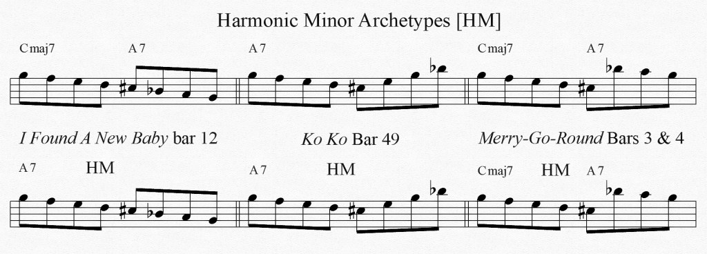 The only minor scale that produces diminished 7th chords is harmonic minor [HM]. Bird deduced this from bar 1, and he uses harmonic minor almost exclusively. (Melodic minor takes second place.) The three archetypes represent the most common forms.