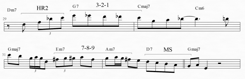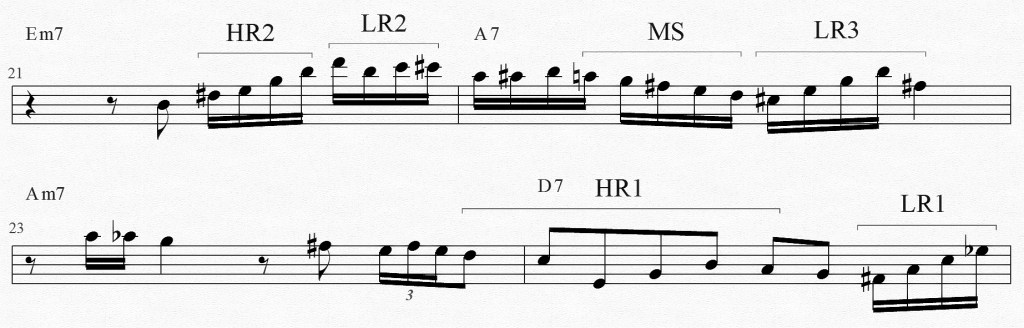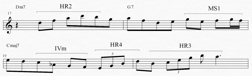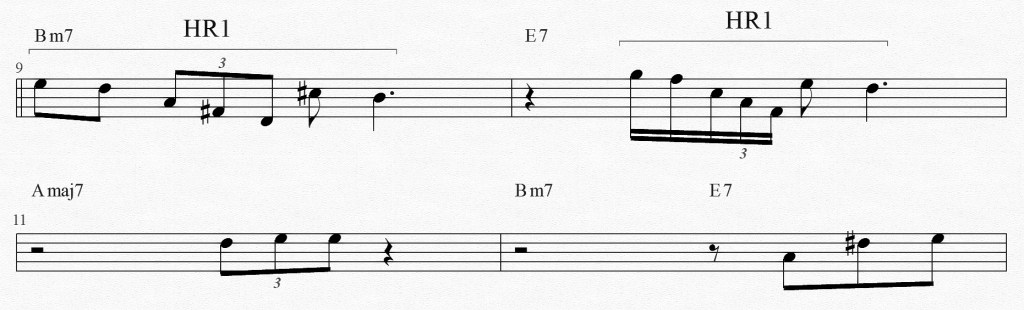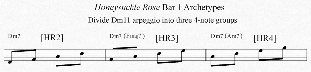 Bird divided these six notes into three 7th chords [HR2] [HR3] [HR4]. The archetypes start with an approach note and end with a downward whole step or half step. Triplets are usually part of the rhythmic structure. Note that HR3 sounds as Fmaj7 and HR4 sounds as Fmaj9