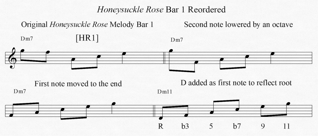 Bird discovered that the reordered notes in bar 1 of Honeysuckle Rose [HR1] spelled out a Dm11 chord. This stairway to the upper structures of the II chord had far reaching implications.