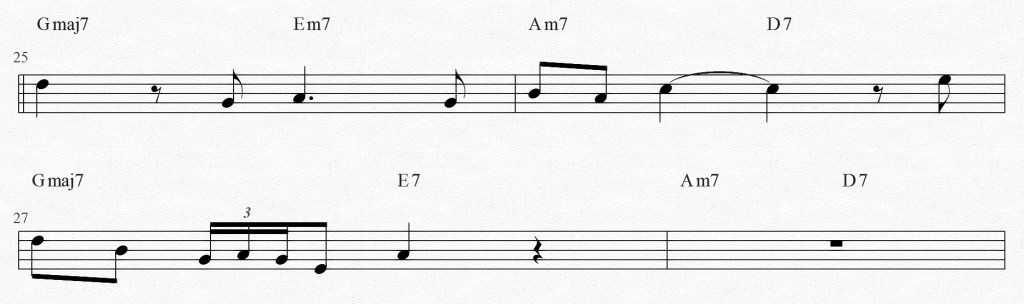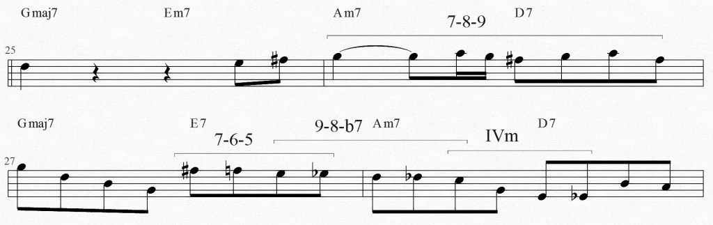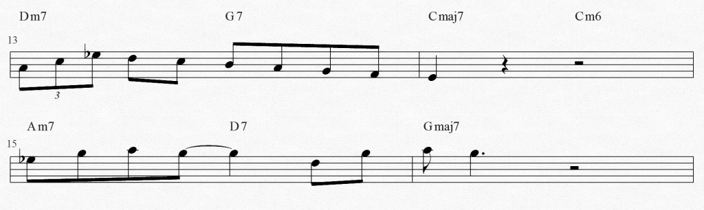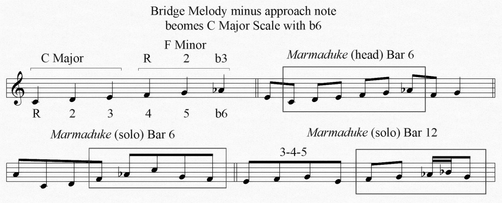 The bridge melody without the approach note can be viewed as a major scale with a b6. This acted as Bird’s guide to IV minor, an important element in his vocabulary.