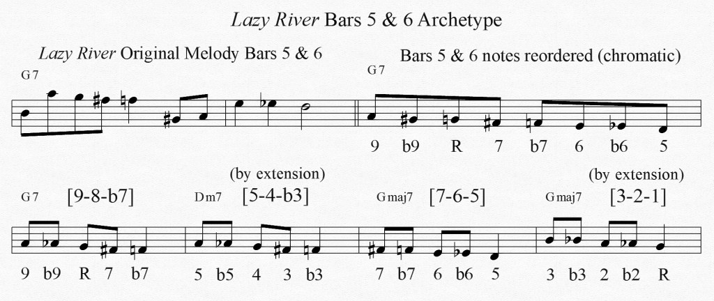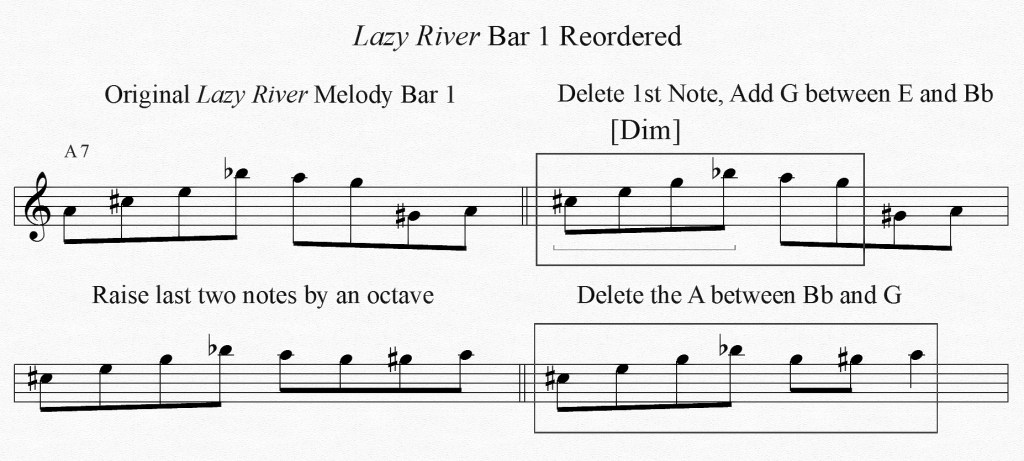 By reordering the notes in Lazy River bar 1, Bird discovered the diminished 7th chord, which creates the dominant 7(b9) sound [Dim]. Further reordering resulted in one of his most common archetypes [LR1].