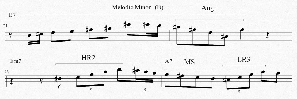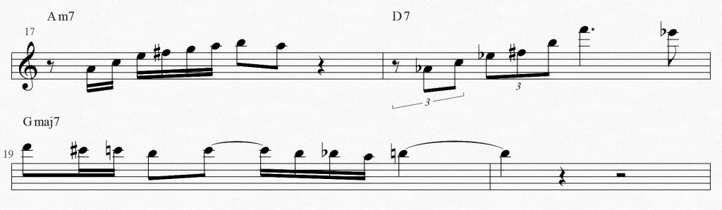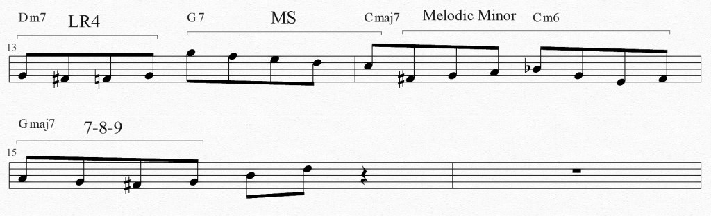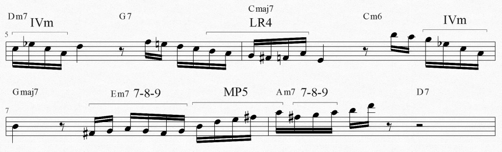 The notes in bar 5 [LR4] became one of Bird’s most common chromatic archetypes, used over dominant 7th chords.