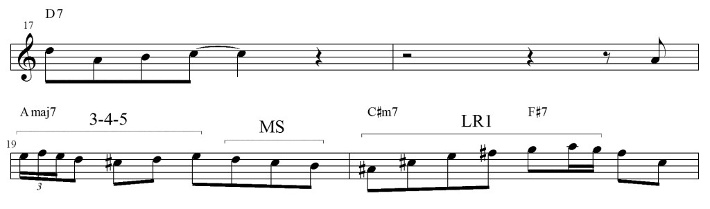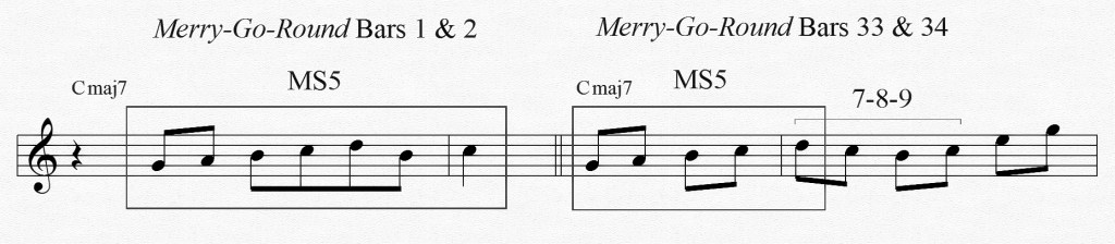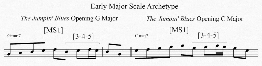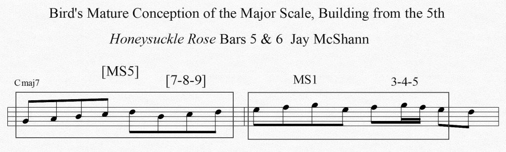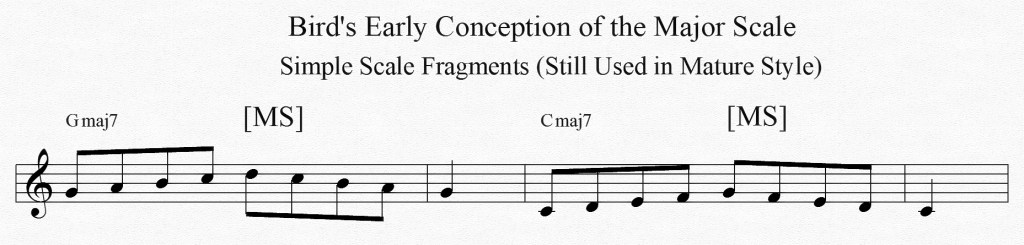 Even in his mature style, Bird uses simple major scale fragments, 1-2-3-4-5 or 5-4-3-2-1, to connect ideas together [MS]. His early major scale archetype was a run up to the 5th and back down to the root, with an ornament in the middle, centered on the 3rd, 4th, and 5th [MS1]. Sometime later, he realized he could build this run from the 5th, so that the ornament centered on the 7th, 8th, and 9th [MS5].