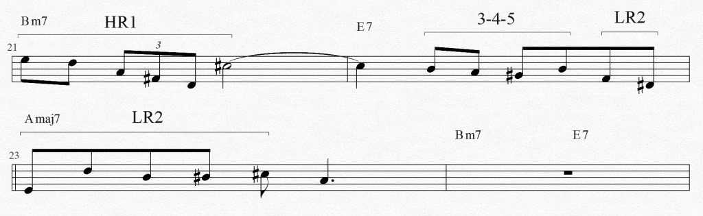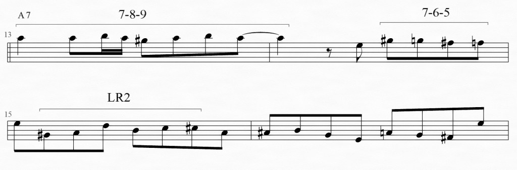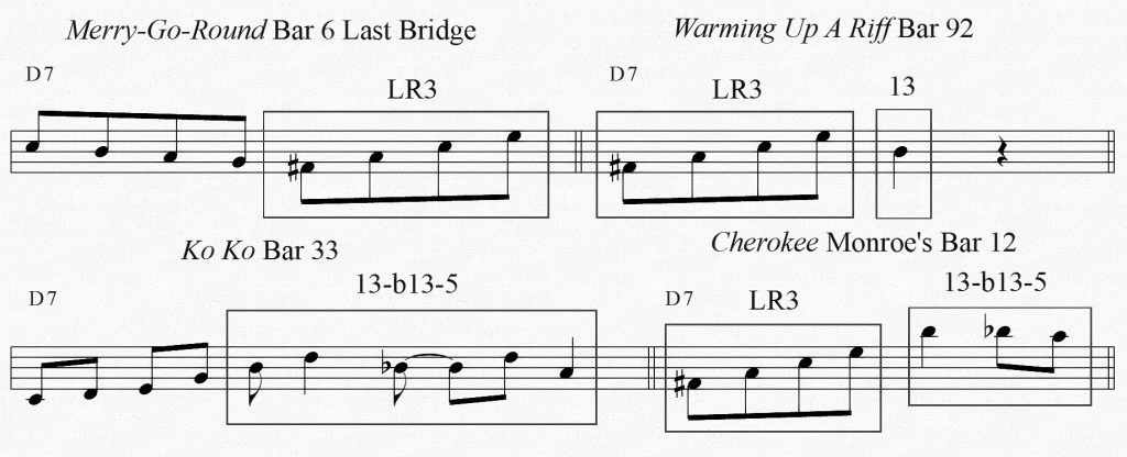 Bird derived another common archetype from bar 3 of Lazy River [LR3]. Whenever he arpeggiates a dominant 7th chord, it’s almost certain he’ll run it upward from the 3rd to the 9th. Bar 4 is a primer on 13ths, spelling out 13-b13-5 on top of the V chord [13-b13-5]. A consistent archetype is hard to define, but Bird uses 13-b13-5 in many contexts.