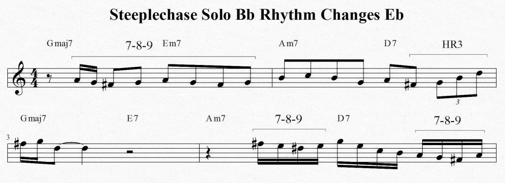 Perhaps required seven takes, which documented a highly unusual phenomenon: Bird starts all seven solos with the same opening phrase, based on the 7-8-9 archetype. He has no qualms about using the leading tone (G#) over the A7. Bird repeats this opening phrase in Steeplechase.