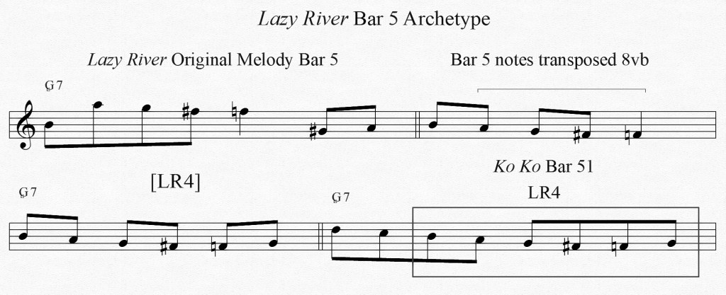 I will conclude this inventory of archetypes with a question: Did Bird ever finish learning the Lazy River melody? For the sake of argument, let’s say yes, because he uses the bar 14 archetype constantly [LR5]. These five notes are identical to the “bebop scale.” Could that scale’s humble beginnings lie in Lazy River? Say what you will, there it is.