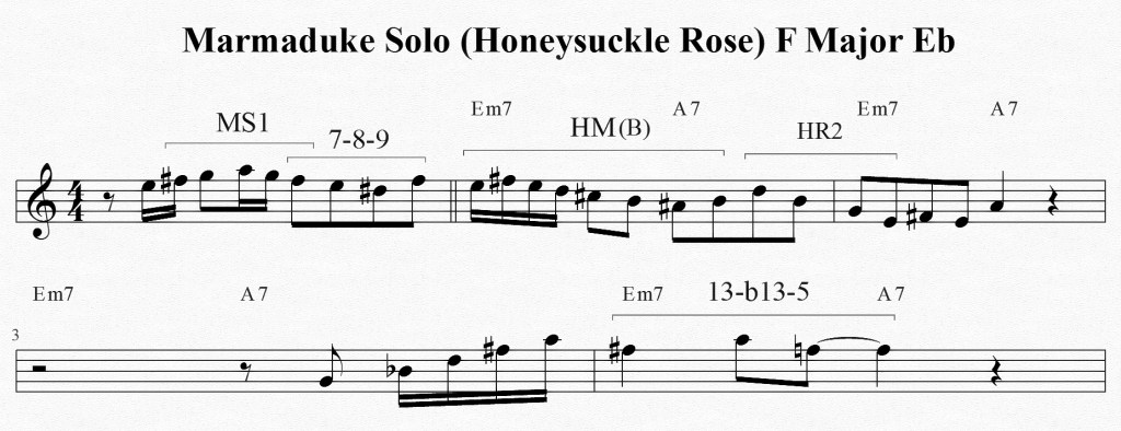 Honeysuckle Rose remained a touchstone throughout Bird’s life, not least because it’s the basis for Scrapple From The Apple. In that instance, he swapped bridges with I Got Rhythm, but the Honeysuckle Rose bridge appears in other compositions, including Merry-Go-Round. Marmaduke, however, is the only reimagining of the original Honeysuckle Rose form.