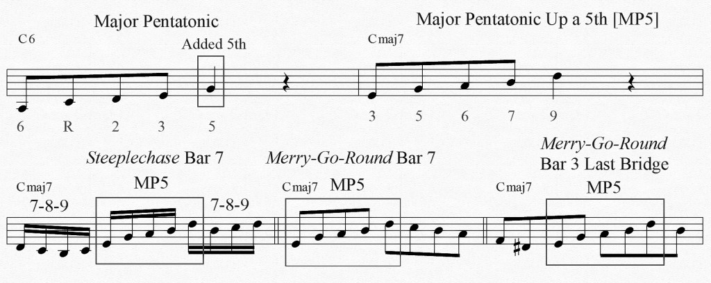 Bird also made use of the major pentatonic scale in a less obvious way, building it from the 5th. This archetype is somewhat different, with no b3, and with the 5th on the top [MP5]. He used it quite often on major I chords.